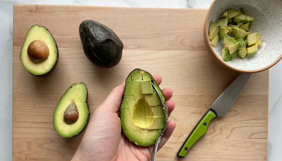 - 과육에 1~1.5cm 간격으로 세로·가로 칼집을 내면 큐브 형태의 과육 판 완성.