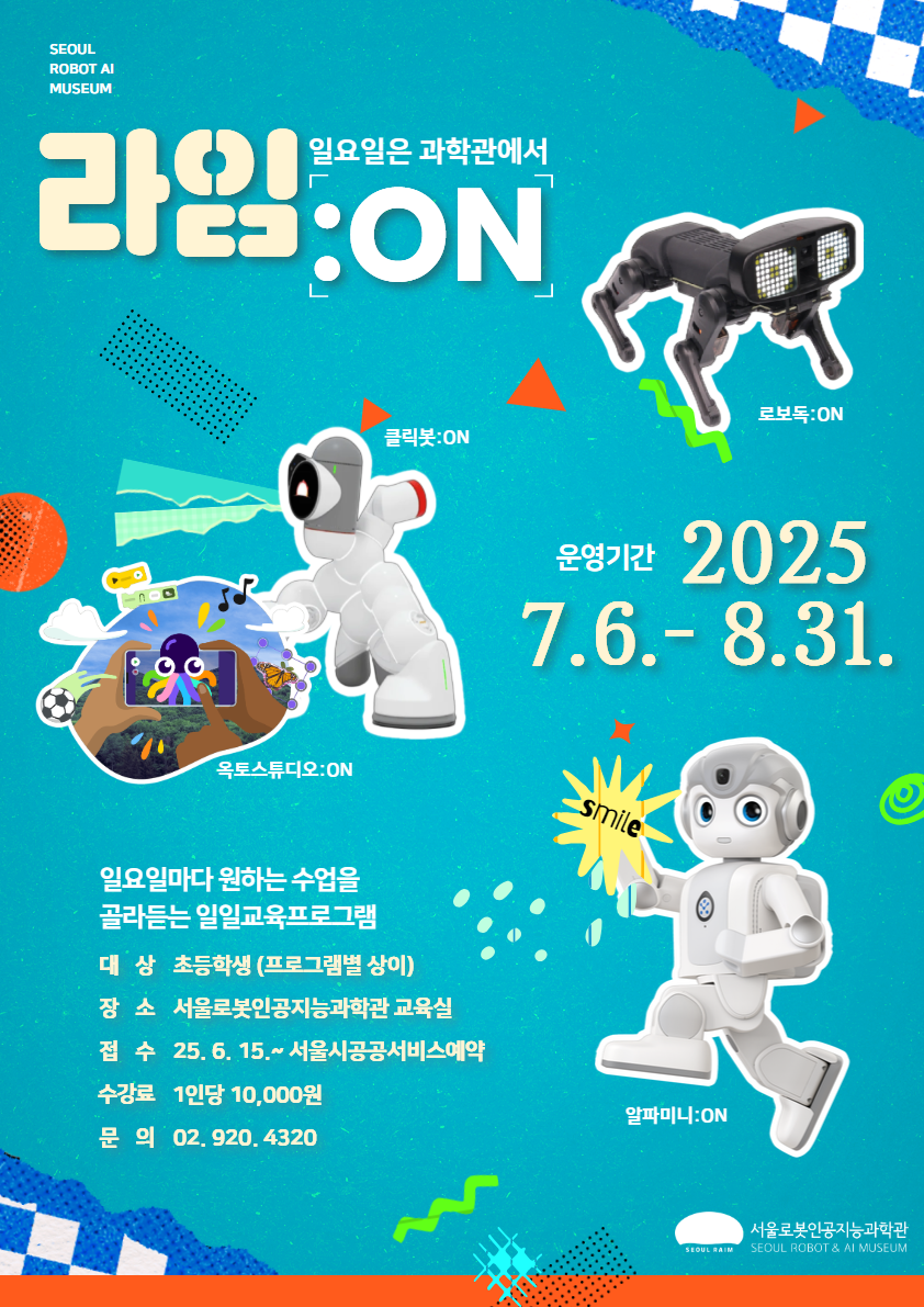 서울로봇인공지능과학관에서 운영하는 **주말 일일교육 프로그램 ‘라임:ON(RAIM:ON)’**은 초등학생을 위한 신개념 로봇 체험 교육 프로그램입니다.